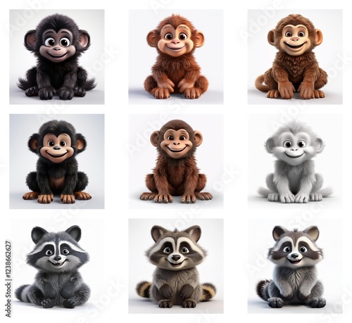 three-dimensional, adorable, animal, art, artwork, baby, black, bright, brown, cartoon, charming, cheerful, children, collection, colours, cute, delightful, design, different, digital, endearing, fluffy, friendly, fur, furry, graphic, grey, group, happy, illustration, illustration, image, innocent, joyful, children, lovely, mammal, miniature, monkey, monkey, picture, playful, primate, raccoon, rendering, set, sitting, small