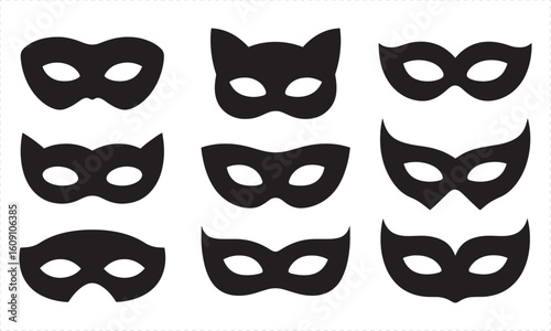 mask, silhouette, black, white, costume, party, disguise, secret, mystery, carnival, venetian, elegant, playful, theatrical, drama, performance, face mask, accessory, celebration, event, graphic, design element, isolated, simple, pattern, collection, variety