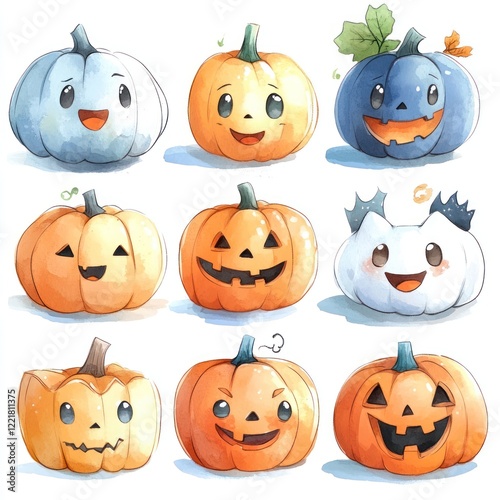 Nine cartoon pumpkins with different expressions and colors, isolated on white background.
