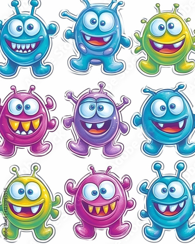 Nine cheerful cartoon monsters; vibrant colors; white background; educational material
