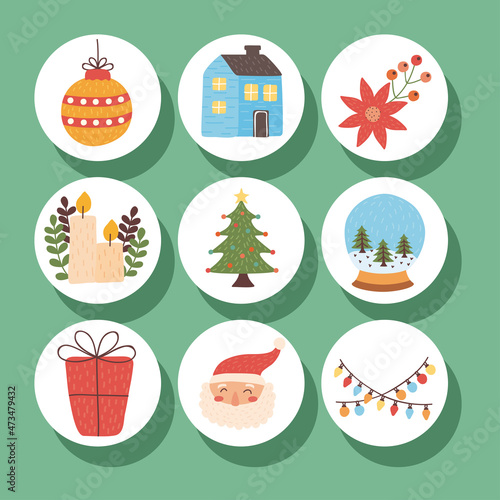 merry, christmas, ball, house, flower, candle, pine, tree, sphere, souvenir, gift, santa, claus, light, bulb, holiday, merry christmas, december, cute, season, winter, celebration, cheerful, ball, seasonal, celebrate, vector, illustration, design, set