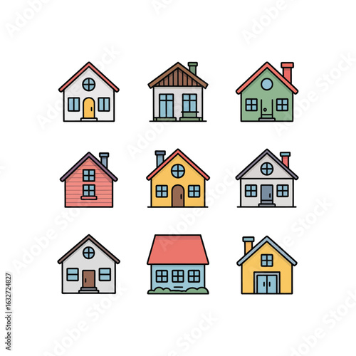 house, home, building, architecture, design, icon, illustration, colourful, style, residential, real, estate, property, dwelling, shelter, roof, window, door, chimney, gable, bungalow, row house, village, urban, suburban, sweet, exterior, image, icon, front, facades, vector, set, symbol, construction, housing, window, town, apartment, real estate, city, business