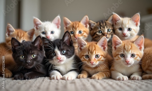 Nine Curious Kittens Looking Attentively at Camera on Beige Surface