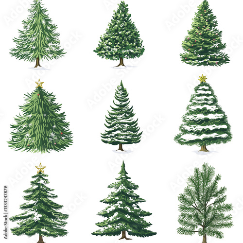 Nine Detailed Evergreen Christmas Trees Winter Holiday Design Elements fir art set red pine dark