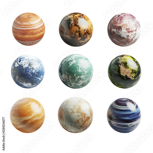 Nine Diverse Planets PNG Against Transparent Background for Space Art, Astronomy Education, or Cosmic Illustrations