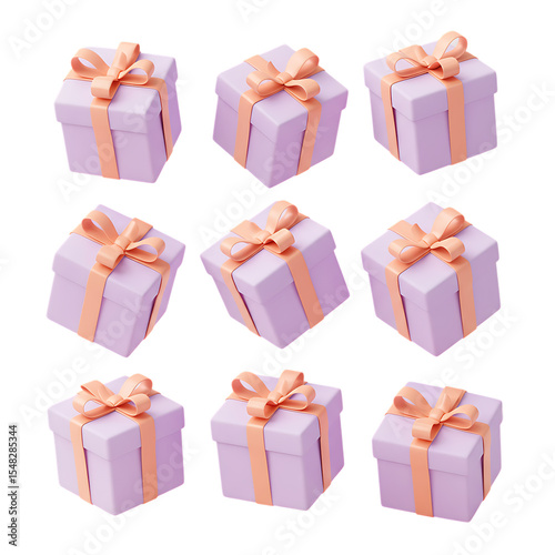 Nine pastel purple gift boxes with peach ribbons and bows on a black background