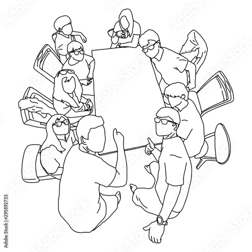 nine people sitting around blank table vector illustration sketch doodle hand drawn with black lines isolated on white background