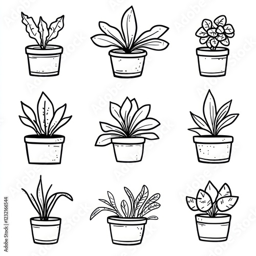 plant, plant, potted, pot, pot, leaf, leaf, foliage, greenery, green, illustration, illustration, drawing, drawing, line, line, simple, design, design, home, decor, decoration, indoor, houseplant, houseplant, nature, botanical, art, artwork, graphic, graphic, vignetting, sketch, outline, outline, black, white, image, collection, set, variety, type