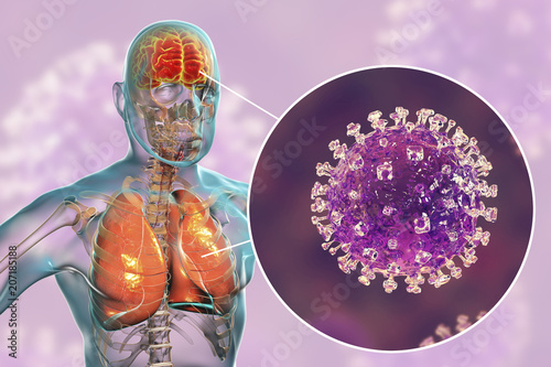 Nipah virus infection, newly emerging zoonotic infection with acute respiratory syndrome and severe encephalitis, 3D illustration