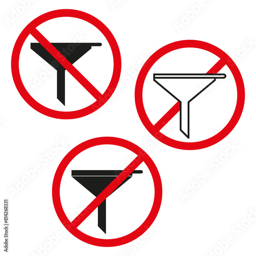 No filtering allowed signs. Prohibited filter icons. Red warning circles. Vector restriction.