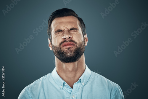 No! Frustrated young man keeping eyes closed while standing against grey background