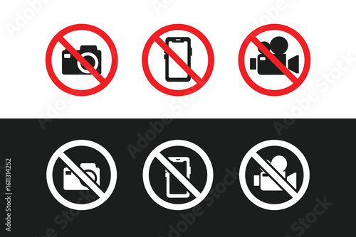 No Photographing prohibition sign symbol icon. Video, photo, phone, prohibited logo pictogram. Vector illustration. Isolated on black and white background.