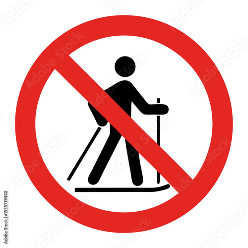 No skiing allowed sign. Prohibition symbol for winter sports activities. Clear prohibition icon for ski resort signage and safety regulations.