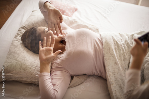 candid, up high, adult, home, bedding, bedchamber, bedtime, bonding, care, carefree, mobile phone, cheerful, children, childhood, comfortable, copy space, cosy, cute, daughter, development, domestic life, dreaming, family, female, happy, holding, home interior, house, innocence, avocation, lifestyle, lying down, mobile phone, morning, mother, napping, offspring, eltern, part of, people, photo, relaxation, resting, schoolgirl