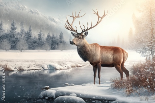animal, cervid, winter, snow, forest, wild, landscape, wildlife, mammal, noble, wilderness, ai, generative, male, portrait, horn, herd, closeup, cold