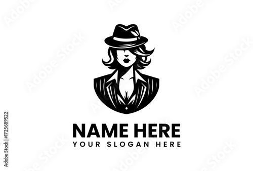 woman, fedora, hat, blazer, suit, silhouette, black, graphic, style, retro, vintage, fashion, elegant, mystery, detective, confident, strong, empowered, female, beauty, glamour, classic, monochrome, vector, illustration, design, icon, symbol, logotype, avatar, head shot, portrait, shoulder, collar, lapel, rimmed, shadow, light, bold, modern, stylised, artistic, creative, professional, businesswoman, leader, boss, power, attitude