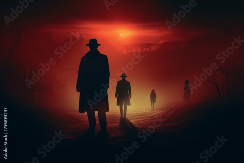 Noir thriller TV show poster with a gradient from fog grey to pitch black, setting the mood for a world of crime and shadowy figures