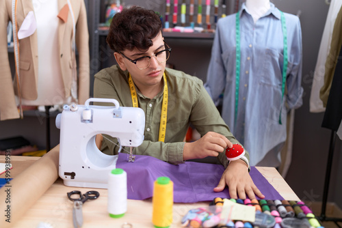 Non binary man tailor holding sewing pin at atelier