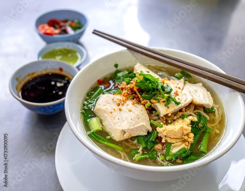 noodle, chicken, herb, broth, bowl, chopstick, asian, food, dish, soup, white, protein, tasty, delicious, hot, eatery, meal, lunch, dinner, fresh, homemade, prepared, served