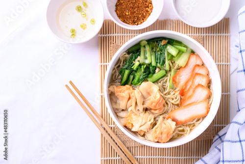 Noodles soup with wonton dumpling and grilled red pork, Asian food, Top view