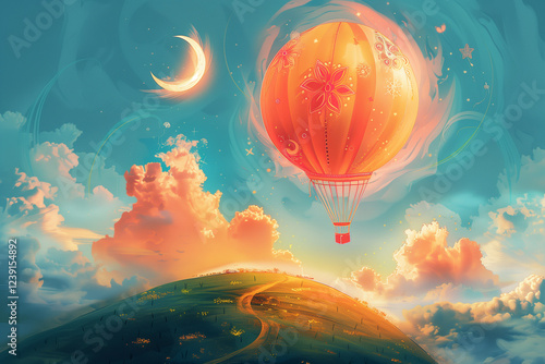 Nordic kid's hand drawn landscape with hot air balloon. Creative children texture for kids textiles, fabrics, decor, wallpapers.