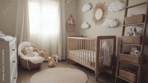 nordic style nursery space, wooden baby cot, natural wood storage unit, decorative sun wall piece, white cloud wall elements, wooden ladder shelf styling, plush toys display, round floor rug, wooden