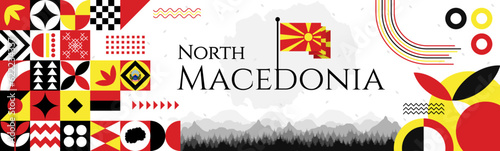 North Macedonia Independence Day abstract banner design with flag and map. Flag color theme geometric pattern retro modern Illustration design. Red, and Yellow flag color template.
