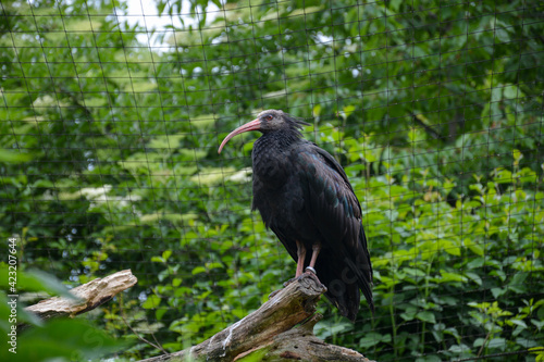 Northern bald ibis (Geronticus eremita) sitting on a branch in Tierpark Bad Mergentheim, Germany, Waldrapp