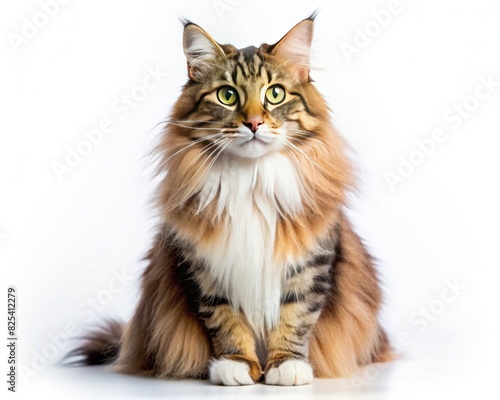 Norwegian Forest breed cat sitting isolated on white background looking at camera.