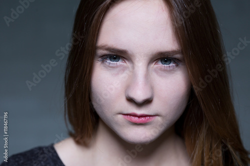 face, girl, woman, emotion, long hair, expression, express, feature, pose, looking, personality, facial expression, mime, countenance, blue eye, brick wall, brick, t-shirt, portrait, anger, determination, determined, ready