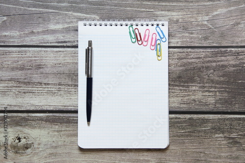 Notepad with a blank white sheet in a checker paper and with ball pen and with paper clips lies on the background of wooden boards