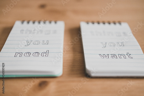 notepads with titles Things you need vs things you want side by side on desk ready for meditation