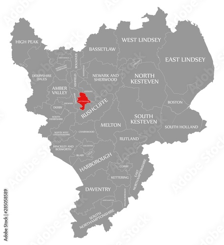 Nottingham red highlighted in map of East Midlands England UK