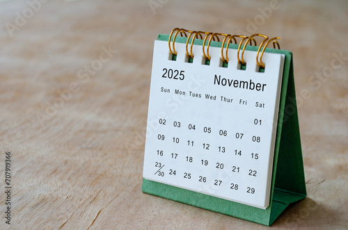 November 2025 table calendar on wooden desk with customizable space for text. Copy space and calendar concept