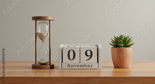 hourglass, calendar, succulent, counting, reading, growing, minimalist, still life, calm, neutral, indoor, office, november, date, sand, block, plant, wood, desk, background, 9, time, day, object, decor, desktop, timer, schedule, appointment, planning, deadline, reminder