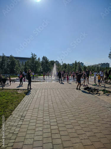 Noyabrsk, Russia - May 30, 2020: Children run and ride near the city fountain. Vertical.