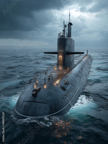submarine, sea, military, warship, underwater, nuclear energy, nautical vessel, shipping, water surface, surveillance, dusk, dark, twilight, transportation, authority, technology, strategy, armed forces, weapon, danger, war, conflict, no people