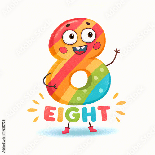 Number 8 in a bold and vibrant style for preschool kids on a white background bright colors, patterns, and textures