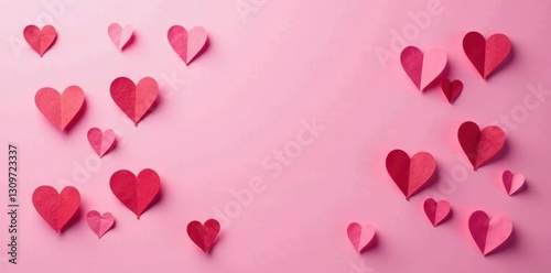 Numerous small paper hearts arranged on pink surface, adorable, valentines, holiday
