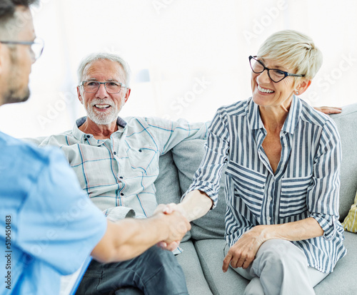 nurse, doctor, senior, couple, home, care, patient, elderly, retirement, caregiver, hospital, nursing, assistance, old, man, woman, female, male, handshake, agreements, shaking, hand, indoor, health, nursing home, happy, person, smiling, help, medicals, caucasian, insurance, support, sitting, visit, disabled, health care, caring, helping, walking, stick, cane, sofa, cheerful, young, lifestyle, disability, disease, aged