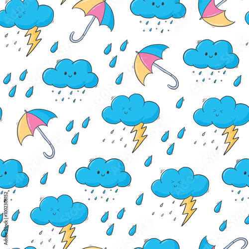 Nursery seamless pattern with clouds doodles, umbrellas, rain drops for prints, wallpaper, textile, wrapping paper, scrapbooking, etc. EPS 10
