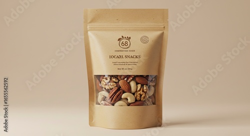 Nut Mix Snack Bag: Healthy Food Packaging, Studio Shot, Neutral Tones, Close-up.