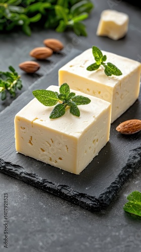 Nut-based cheese on slate plate dramatic lighting culinary photography emphasizing texture and color
