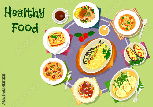 food, meal, dinner, lunch, vector, eatery, cookery, dish, menu, icon, flat, vegetable, meat, fish, salad, soup, pasta, bread, chicken, cheese, tomatoes, liver, onion, stew, toast, aubergine, potato, casserole, illustration, mediterranean, design, snack, plate, topview, beet, trout, mash, ingredient, healthy, kitchen, graphic