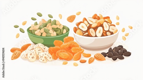 flat, design, healthy, snack, nut, seed, dried, fruit, alimentary, variety, wellness, well-being, balanced, diet, health, food, natural, organic, dietary, fiber, antioxidant, vitamin, mineral, energy, promoting, colourful, vector, illustration, lifestyle, vegetarian, culinary, ingredient, breakfast, bowl, meal, white, cereal, delicious, isolated, snack, fresh, sweet, cream, dish, chocolate, cornflake, flower