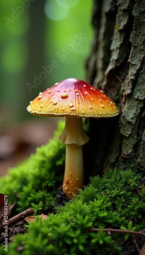 Oak mushroom grows in moss beneath tree trunk, brown, nature sounds, nature