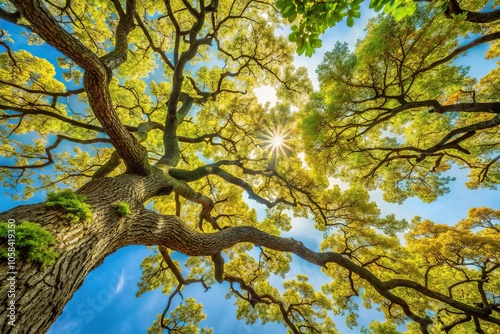 Oak tree branches stretching towards the sky with leaves rustling in wind, nature, autumnal hues, leafy greens, verdant canopy, seasonal change