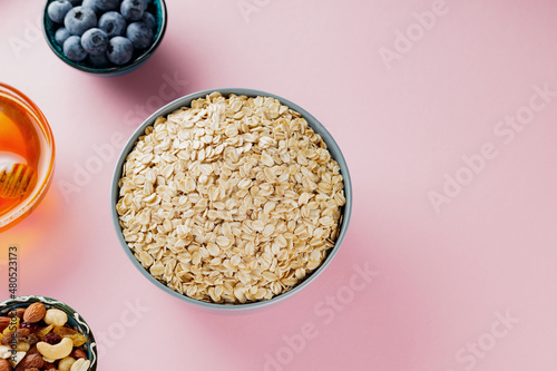 Oat flakes, blueberries, nuts and honey on a pink background. Dry oatmeal and dietary breakfast ingredients. Healthy breakfast concept. Copy space. Top view