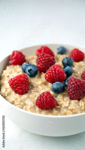 Oatmeal breakfast bowl topped with fresh raspberries and blueberries for a healthy and delicious start to the day