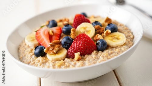 Oatmeal porridge topped with sliced strawberries, blueberries, banana slices and walnuts, served in a white bowl on a white wooden table, makes for a healthy and delicious breakfast